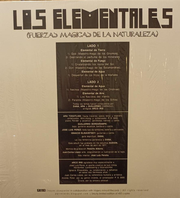 Tracklist: . Elemental De Tierra, A1. Gob (Maestro-Mago De Los Gnomos), A2. Destilando El Perfume De Los Minerales, . Elemental De Fuego, A3a. Cristalizando Los Rayos Del Sol, A3b. Djin (Maestro-Mago De Las Salamandras), . Elemental De Agua, A4. Despertar De Los Hijos De La Mañana, B1. Necksa (Maestro-Mago De Las Ondinas), . Elemental De Aire, B2a. Los Nacidos Del Viento, B2b. Paralda (Maestro-Mago De Los Silfos)