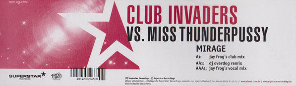 Tracklist: A. Mirage (Jay Frog's Club Mix), B1. Mirage (DJ Overdog Remix), B2. Mirage (Jay Frog's Vocal Mix)