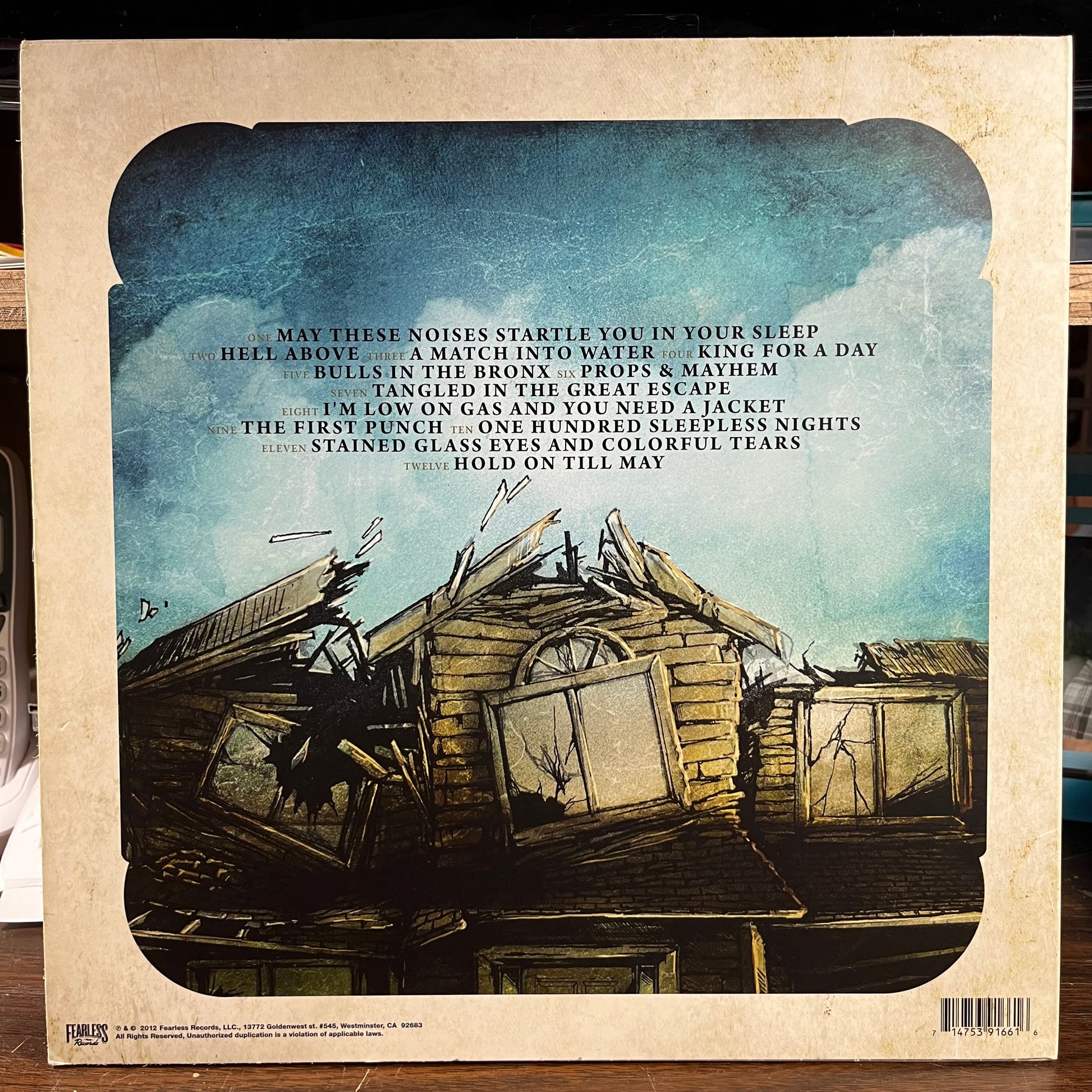 Tracklist: A1. May These Noises Startle You In Your Sleep, A2. Hell Above, A3. A Match Into Water, A4. King For A Day, A5. Bulls In The Bronx, A6. Props & Mayhem, B1. Tangled In The Great Escape, B2. I'm Low On Gas And You Need A Jacket, B3. The First Punch, B4. One Hundred Sleepless Nights, B5. Stained Glass Eyes And Colorful Tears, B6. Hold On Til May