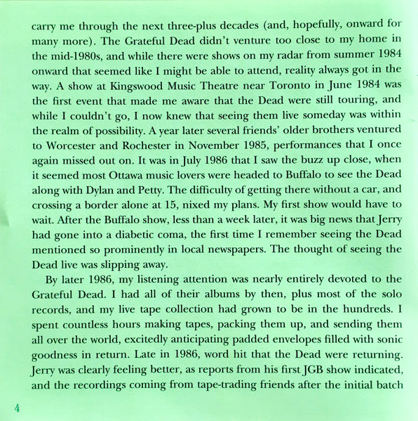 Tracklist: . Hartford Civic Center, Hartford, CT (3/26/87), 1-1. In The Midnight Hour, 1-2. Cold Rain And Snow, 1-3. C. C. Rider, 1-4. Row Jimmy, 1-5. My Brother Esau, 1-6. When Push Comes To Shove, 1-7. Desolation Row, 1-8. Bird Song, 1-9. Promised Land, 2-1. China Cat Sunflower, 2-2. I Know You Rider, 2-3. Looks Like Rain, 2-4. He's Gone, 2-5. Drums, 2-6. Space, 2-7. I Need A Miracle, 2-8. Black Peter, 2-9. Around And Around, 2-10. Good Lovin', 2-11. The Mighty Quinn (Quinn The Eskimo), . Hartford Civic Center, Hartford, CT (3/27/87), 3-1. Alabama Getaway, 3-2. Greatest Story Ever Told, 3-3. West L.A. Fadeaway, 3-4. Little Red Rooster, 3-5. Brown-Eyed Women, 3-6. Beat It On Down The Line, 3-7. Tennessee Jed, 3-8. The Music Never Stopped, 3-9. Touch Of Grey, 3-10. Samson And Delilah, 3-11. Cumberland Blues, 4-1. Estimated Prophet, 4-2. Eyes Of The World, 4-3. Drums, 4-4. Space, 4-5. Uncle John's Band, 4-6. Morning Dew, 4-7. Johnny B. Goode