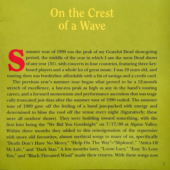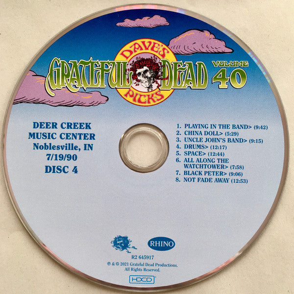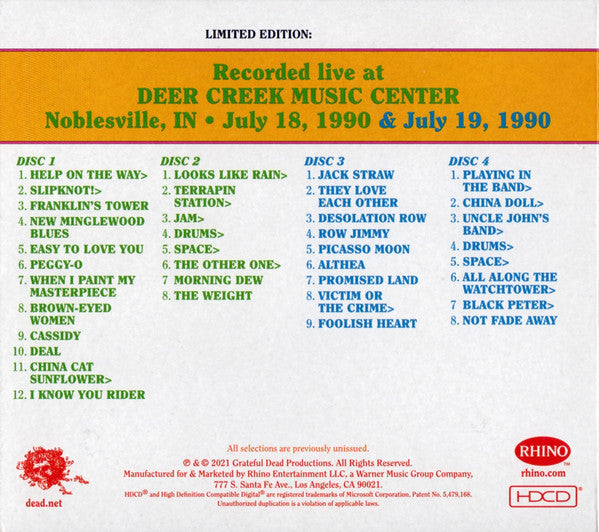 Tracklist: . Deer Creek Music Center, Noblesville, IN (7/18/90), 1-1. Help On The Way, 1-2. Slipknot!, 1-3. Franklin's Tower, 1-4. New Minglewood Blues, 1-5. Easy To Love You, 1-6. Peggy-O, 1-7. When I Paint My Masterpiece, 1-8. Brown-Eyed Women, 1-9. Cassidy, 1-10. Deal, 1-11. China Cat Sunflower, 1-12. I Know You Rider, 2-1. Looks Like Rain, 2-2. Terrapin Station, 2-3. Jam, 2-4. Drums, 2-5. Space, 2-6. The Other One, 2-7. Morning Dew, 2-8. The Weight, . Deer Creek Music Center, Noblesville, IN (7/19/90), 3-1. Jack Straw, 3-2. They Love Each Other, 3-3. Desolation Row, 3-4. Row Jimmy, 3-5. Picasso Moon, 3-6. Althea, 3-7. Promised Land, 3-8. Victim Or The Crime, 3-9. Foolish Heart, 4-1. Playing In The Band, 4-2. China Doll, 4-3. Uncle John's Band, 4-4. Drums, 4-5. Space, 4-6. All Along The Watchtower, 4-7. Black Peter, 4-8. Not Fade Away