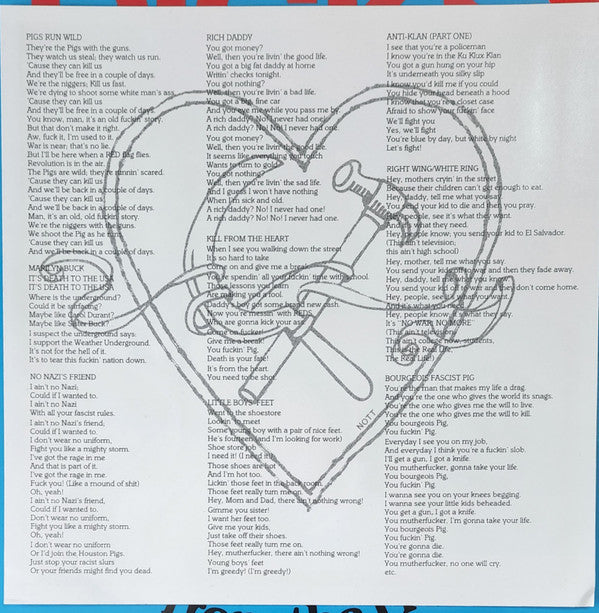 Tracklist: A1. Anti-Klan (Part One), A2. Rich Daddy, A3. No Nazi's Friend, A4. Marilyn Buck, A5. Kill From The Heart, A6. Little Boys' Feet, A7. Pigs Run Wild, A8. Bourgeois Fascist Pig, A9. Purple Haze, B1. Anti-Klan (Part Two), B2. Right Wing/White Ring, . Dicks Can't Swim