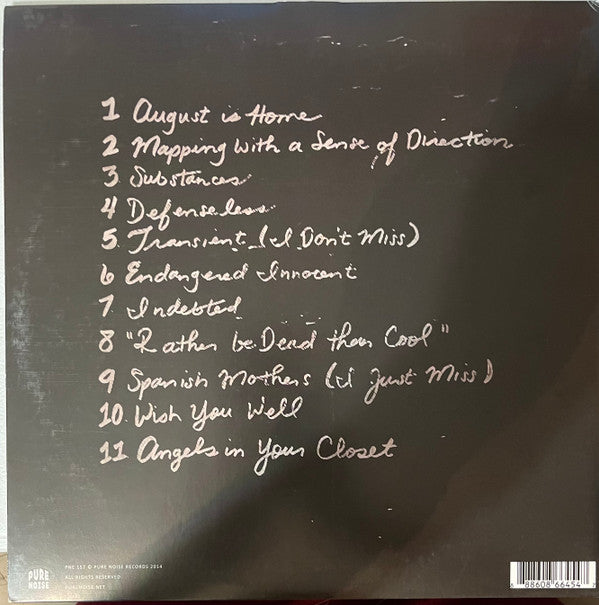 Tracklist: A1. August Is Home, A2. Mapping With A Sense Of Direction, A3. Substances, A4. Defenseless, A5. Transient (I Don't Miss), A6. Endangered Innocence, B1. Indebted, B2. Rather Be Dead Than Cool, B3. Spanish Mother's (I Just Miss), B4. Wish You Well, B5. Angels In Your Closet