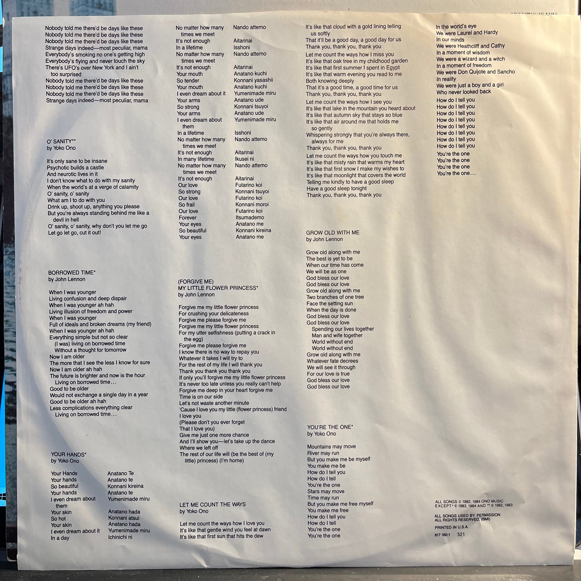 Tracklist: A1. I'm Stepping Out, A2. Sleepless Night, A3. I Don't Wanna Face It, A4. Don't Be Scared, A5. Nobody Told Me, A6. O'Sanity, B1. Borrowed Time, B2. Your Hands, B3. (Forgive Me) My Little Flower Princess, B4. Let Me Count The Ways, B5. Grow Old With Me, B6. You're The One