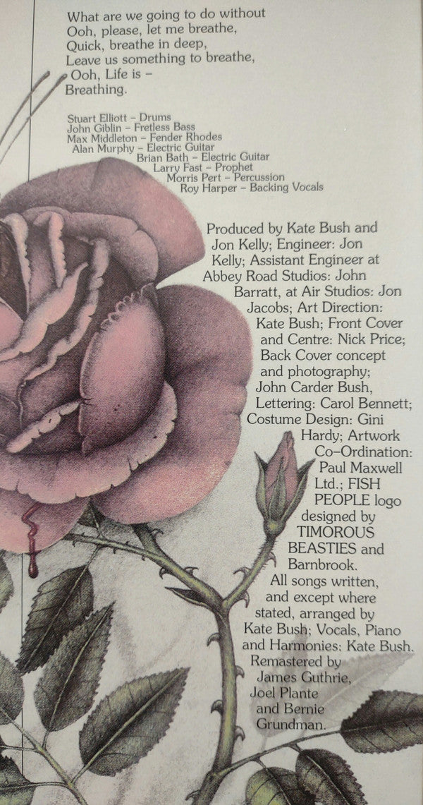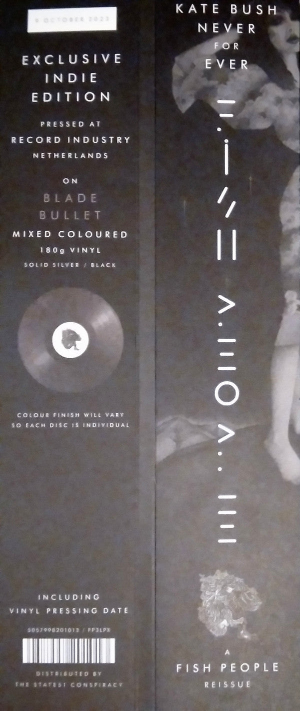 Kate Bush & Fish people records are proud and excited to announce new pressings of all 10 of Kate Bush's albums "It's very exciting to see people appreciating the physical presence of an album released on vinyl. It's how it's always been for me, especially when I was a teenager. The whole buzz of the record store was part of the experience. Buying an album was an event. " Kate Bush. The records are all pressed on 180gm vinyl at the world-renowned Record Industry plant in the Netherlands. New lacquers were cut from the 2018 remasters by Bernie Grundman and overseen by mastering engineer James Guthrie. All designed by Kate and feature new Fish People label designs, stunning colour vinyl combinations and obi strips with pressing date. They are protected in resealable poly-bag liners with a 'Fish People Reissue' sticker, bottom right. Never For Ever was Kate's first no. 1 album. It was also the first ever album by a British female solo artist to top the UK album chart, as well as being the first album by any female solo artist to enter the chart at no. 1. It has since been certified Gold by the British Phonographic Industry. Kate co-produced the album with Jon Kelly. 180gm Blade Bullett-metal grey indie edition. Obi strip with pressing date Resealable poly-sleeve with sticker