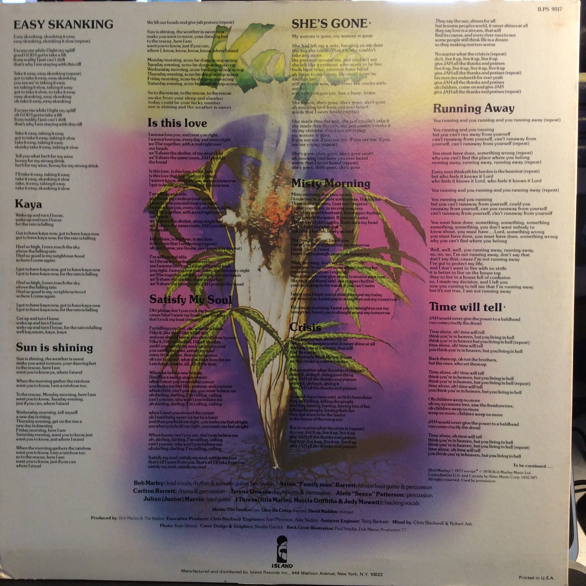 (Bob Marley) © 1977 except tracks B1 and B5 © 1978 Bob Marley Music Ltd. Controlled for U.S. and Canada by Almo Music Corp. (ASCAP) [Jacket]