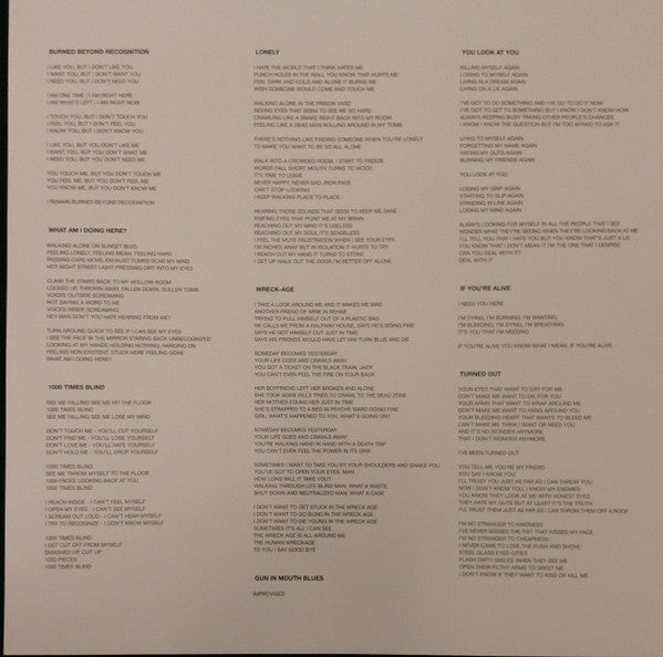 Tracklist: A1. Burned Beyond Recognition, A2. What Am I Doing Here?, A3. 1000 Times Blind, A4. Lonely, A5. Wreck-Age, B1. Gun In Mouth Blues, B2. You Look At Me, B3. If You're Alive, B4. Turned Out