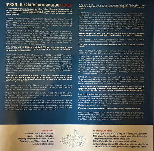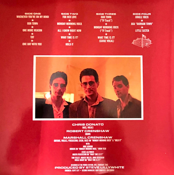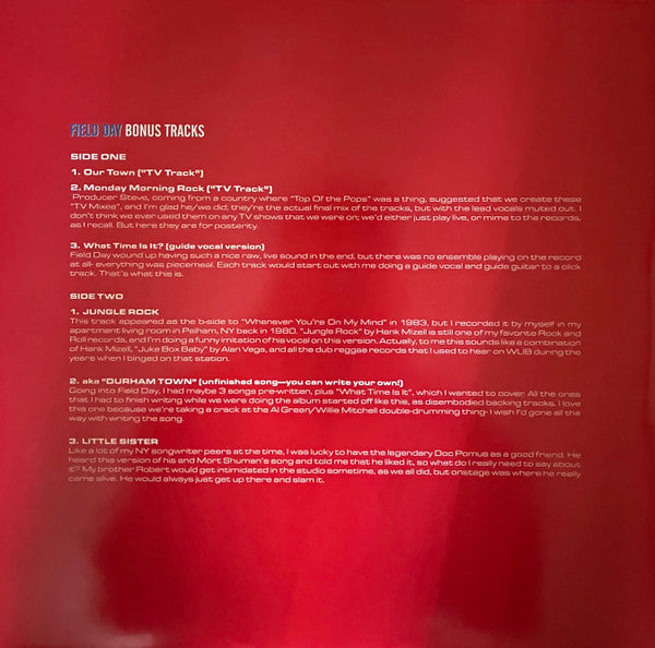 Tracklist: . Field Day, A1. Whenever You're On My Mind, A2. Our Town, A3. One More Reason, A4. Try, A5. One Day With You, B1. For Her Love, B2. Monday Morning Rock, B3. All I Now Right Now, B4. What Time Is It?, B5. Hold It, . Field Day Bonus Tracks, C1. Our Town ("TV Track"), C2. Monday Morning Rock ("TV Track"), C3. What Time Is It? (Guide Vocal), B1. Jungle Rock, B2. AKA "Durham Town", B3. Little Sister