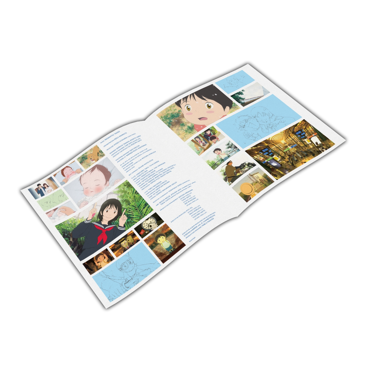 The soundtrack for the film was written by Masakatsu Takagi, who had previously scored Hosoda's Wolf Children and The Boy and the Beast. His work for Studio Chizu has been praised for its magical and whimsical atmosphere. For Mirai specifically, this dreamy aesthetic was mixed with a contemporary sound and made to be simple in tone and be reflective of family.