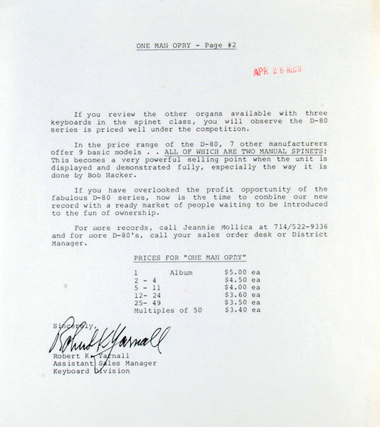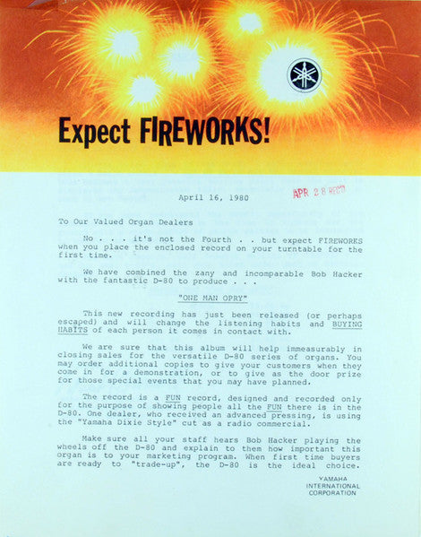 "One Man Opry" Bob Hacker Plays The Yamaha Electone D-80 (VINYL) | Near Mint (NM) Excellent (EX)