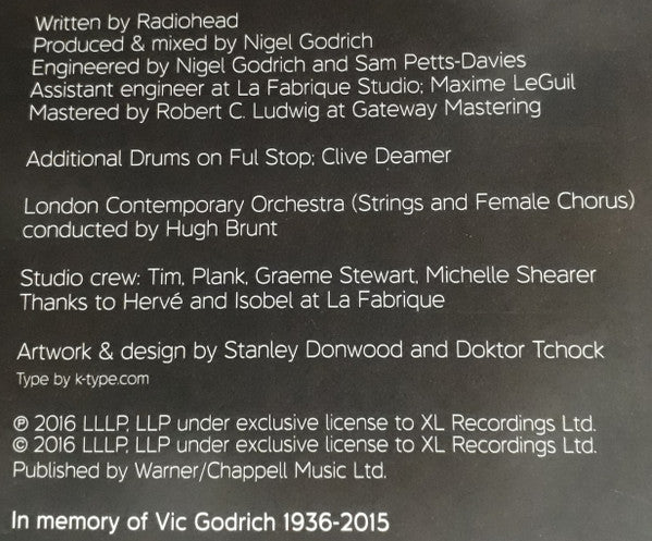 Tracklist: A1. Burn The Witch, A2. Daydreaming, B1. Decks Dark, B2. Desert Island Disk, B3. Ful Stop, C1. Glass Eyes, C2. Identikit, C3. The Numbers, D1. Present Tense, D2. Tinker Tailor Soldier Sailor Rich Man Poor Man Beggar Man Thief, D3. True Love Waits