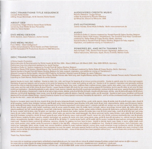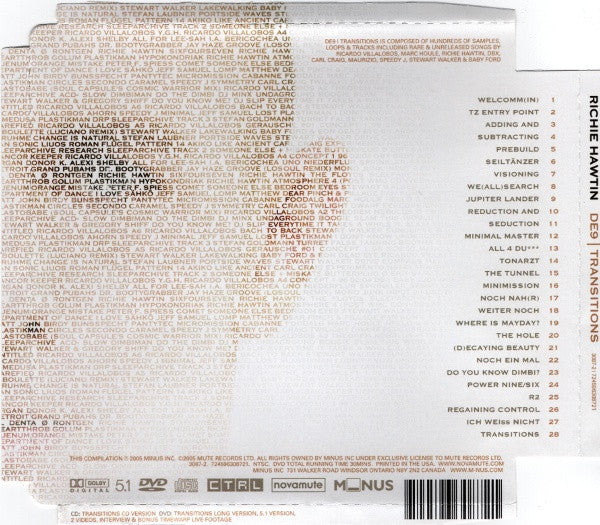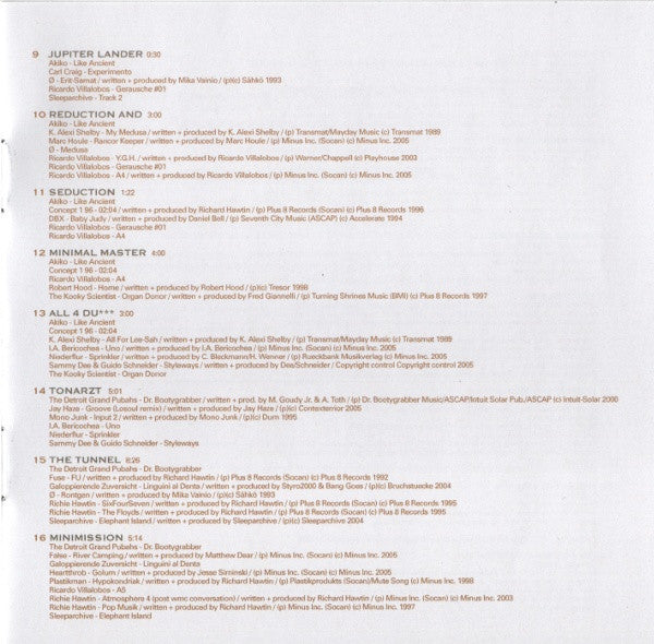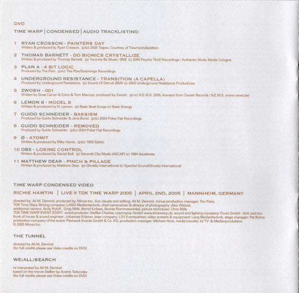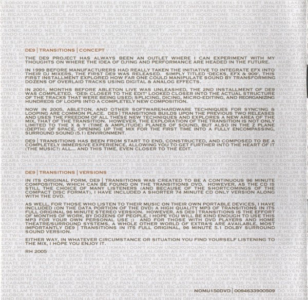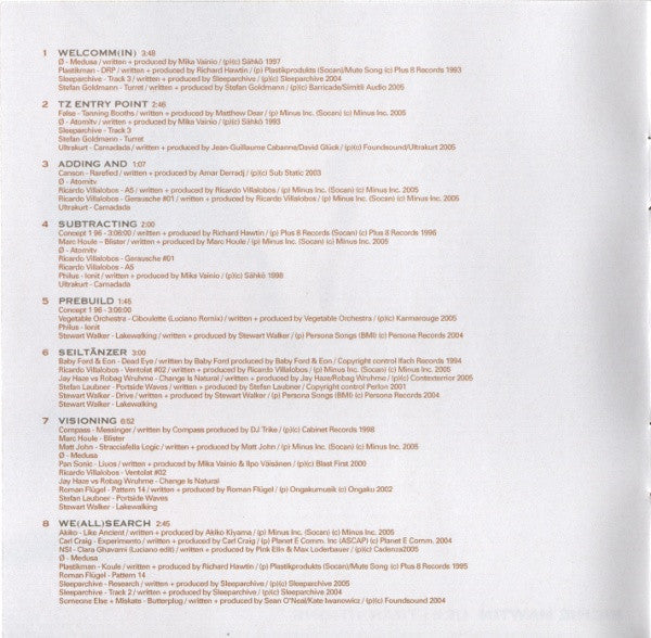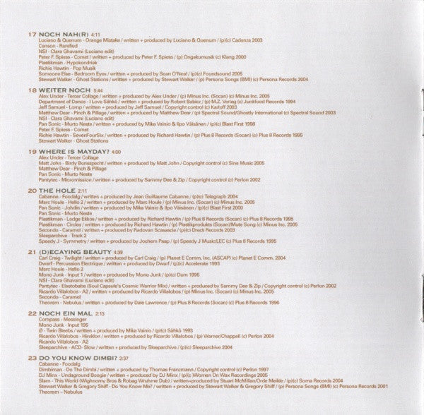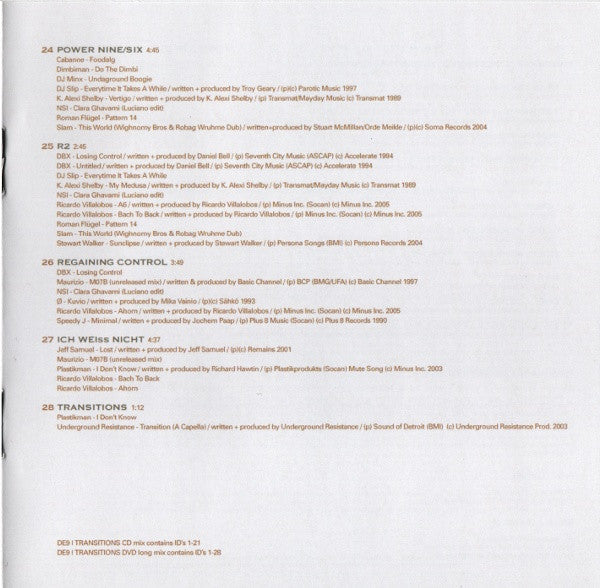 Tracklist: . Full Mix (5.1 Dolby Surround & PCM Stereo), . Welcomm(In), DVD-1.1. Medusa, DVD-1.2. DRP, DVD-1.3. Track 3, DVD-1.4. Turret, . TZ Entry Point, DVD-2.1. Tanning Booths, DVD-2.2. Atomitv, DVD-2.3. Track 3, DVD-2.4. Turret, DVD-2.5. Camadada, . Adding And, DVD-3.1. Rarefied, DVD-3.2. Atomitv, DVD-3.3. A5, DVD-3.4. Gerausche #01, DVD-3.5. Camadada, . Subtracting, DVD-4.1. 96 - 03:06, DVD-4.2. Blister, DVD-4.3. Atomitv, DVD-4.4. Gerausche #01, DVD-4.5. A5, DVD-4.6. Ionit, DVD-4.7. Camadada, . Prebuild, DVD-5.1. 96 - 03:06, DVD-5.2. Ciboulette (Luciano Remix), DVD-5.3. Ionit, DVD-5.4. Lakewalking, . Seiltänzer, DVD-6.1. Dead Eye, DVD-6.2. Ventolat #02, DVD-6.3. Change Is Natural, DVD-6.4. Portside Waves, DVD-6.5. Drive, DVD-6.6. Lakewalking, . Visioning, DVD-7.1. Messinger, DVD-7.2. Blister, DVD-7.3. Stracciafella Logic, DVD-7.4. Medusa, DVD-7.5. Liuos, DVD-7.6. Ventolat #02, DVD-7.7. Change Is Natural, DVD-7.8. Pattern 14, DVD-7.9. Portside Waves, DVD-7.10. Lakewalking, . We (All) Search, DVD-8.1. Like Ancient, DVD-8.2. Experimento, DVD-8.3. Clara Ghavami (Luciano Edit), DVD-8.4. Medusa, DVD-8.5. Koule, DVD-8.6. Pattern 14, DVD-8.7. Research, DVD-8.8. Track 2, DVD-8.9. Butterplug, . Jupiter Lander, DVD-9.1. Like Ancient, DVD-9.2. Experimento, DVD-9.3. Erit-Samat, DVD-9.4. Gerausche #01, DVD-9.5. Track 2, . Reduction And, DVD-10.1. Like Ancient, DVD-10.2. My Medusa, DVD-10.3. Rancor Keeper, DVD-10.4. Medusa, DVD-10.5. Y.G.H., DVD-10.6. Gerausche #01, DVD-10.7. A4, . Seduction, DVD-11.1. Like Ancient, DVD-11.2. 96 - 02:04, DVD-11.3. Baby Judy, DVD-11.4. Gerausche #01, DVD-11.5. A4, . Minimal Master, DVD-12.1. Like Ancient, DVD-12.2. 96 - 02:04, DVD-12.3. A4, DVD-12.4. Home, DVD-12.5. Organ Donor, . All 4 Du***, DVD-13.1. Like Ancient, DVD-13.2. 96 - 02:04, DVD-13.3. All For Lee-Sah, DVD-13.4. Uno, DVD-13.5. Sprinkler, DVD-13.6. Styleways, DVD-13.7. Organ Donor, . Tonarzt, DVD-14.1. Dr. Bootygrabber, DVD-14.2. Groove (Losoul Remix), DVD-14.3. Input 2, DVD-14.4. Uno, DVD-14.5. Sprinkler, DVD-14.6. Styleways, . The Tunnel, DVD-15.1. Dr. Bootygrabber, DVD-15.2. FU, DVD-15.3. Linguini Al Denta, DVD-15.4. Rontgen, DVD-15.5. SixFourSeven, DVD-15.6. The Floyds, DVD-15.7. Elephant Island, . Minimission, DVD-16.1. Dr. Bootygrabber, DVD-16.2. River Camping, DVD-16.3. Linguini Al Denta, DVD-16.4. Golum, DVD-16.5. Hypokondriak, DVD-16.6. A5, DVD-16.7. Atmosphere 4 (Post WMC Conversation), DVD-16.8. Pop Musik, DVD-16.9. Elephant Island, . Noch Nah(r), DVD-17.1. Orange Mistake, DVD-17.2. Rarefied, DVD-17.3. Clara Ghavami (Luciano Edit), DVD-17.4. Comet, DVD-17.5. Hypokondriak, DVD-17.6. Pop Musik, DVD-17.7. Bedroom Eyes, DVD-17.8. Ghost Stations, . Weiter Noch, DVD-18.1. Tercer Collage, DVD-18.2. I Love Sähkö, DVD-18.3. Lomp, DVD-18.4. Pinch & Pillage, DVD-18.5. Clara Ghavami (Luciano Edit), DVD-18.6. Murto Neste, DVD-18.7. Comet, DVD-18.8. SevenFourSix, DVD-18.9. Ghost Stations, . Where Is Mayday?, DVD-19.1. Tercer Collage, DVD-19.2. Birdy Bunsspecht, DVD-19.3. Pinch & Pillage, DVD-19.4. Murto Neste, DVD-19.5. Micromission, . The Hole, DVD-20.1. Foodalg, DVD-20.2. Hello 2, DVD-20.3. Johdin, DVD-20.4. Murto Neste, DVD-20.5. Lodge Ekkos, DVD-20.6. Circles, DVD-20.7. Caramel, DVD-20.8. Track 2, DVD-20.9. Symmetry, . (D)ecaying Beauty, DVD-21.1. Twilight, DVD-21.2. Percussion Electrique, DVD-21.3. Hello 2, DVD-21.4. Input 1, DVD-21.5. Clara Ghavami (Luciano Edit), DVD-21.6. Elastobabe (Soul Capsule's Warrior Mix), DVD-21.7. A2, DVD-21.8. Caramel, DVD-21.9. Nebulus, . Noch Ein Mal, DVD-22.1. Messinger, DVD-22.2. Input 195, DVD-22.3. Twin Bleebs, DVD-22.4. Hireklon, DVD-22.5. A2, DVD-22.6. ACD-Slow, . Do You Know Dimbi?, DVD-23.1. Foodalg, DVD-23.2. Do The Dimbi, DVD-23.3. Undaground Boogie, DVD-23.4. This World (Wighnomy Brothers & Robag Wruhme Dub), DVD-23.5. Do You Know Me?, DVD-23.6. Nebulus, . Power Nine/Six, DVD-24.1. Foodalg, DVD-24.2. Do The Dimbi, DVD-24.3. Undaground Boogie, DVD-24.4. Everytime It Takes A While, DVD-24.5. Vertigo, DVD-24.6. Clara Ghavami (Luciano Edit), DVD-24.7. Pattern 14, DVD-24.8. This World (Wighnomy Brothers & Robag Wruhme Dub), . R2, DVD-25.1. Losing Control, DVD-25.2. Untitled, DVD-25.3. Everytime It Takes A While, DVD-25.4. My Medusa, DVD-25.5. Clara Ghavami (Luciano Edit), DVD-25.6. A6, DVD-25.7. Bach To Back, DVD-25.8. Pattern 14, DVD-25.9. This World (Wighnomy Brothers & Robag Wruhme Dub), DVD-25.10. Sunclipse, . Regaining Control, DVD-26.1. Losing Control, DVD-26.2. M7/B (Unreleased Mix), DVD-26.3. Clara Ghavami (Luciano Edit), DVD-26.4. Kuvio, DVD-26.5. Ahorn, DVD-26.6. Minimal, . Ich Weiss Nicht, DVD-27.1. Lost, DVD-27.2. M7/B (Unreleased Mix), DVD-27.3. I Don't Know, DVD-27.4. Bach To Back, DVD-27.5. Ahorn, . Transitions, DVD-28.1. I No, DVD-28.2. Transition (A Capella), . -, DVD-29. We(All)Search, DVD-30. The Tunnel, DVD-31. About DE9, . Timewarp | Condensed, DVD-32. Timewarp | Condensed, DVD-33.1. Painters Day, DVD-33.2. Do Bionics Crystallize, DVD-32.3. 4 Bit Logic, DVD-33.4. Transition (A Capella), DVD-33.5. 001, DVD-33.6. Model 8, DVD-33.7. Bassism, DVD-33.8. Removed, DVD-33.9. Atomitv, DVD-33.10. Losing Control, DVD-33.11. Pinch & Pillage, . Audio Credits, DVD-34. Gugga Sempa, . Video Credits, DVD-35. Gugga Sempa, . DVD Menu Music, DVD-Menu. Silent Intelligence II, . -, . Welcomm(In), CD-1.1. Medusa, CD-1.2. DRP, CD-1.3. Track 3, CD-1.4. Turret, . TZ Entry Point, CD-2.1. Tanning Booths, CD-2.2. Atomitv, CD-2.3. Track 3, CD-2.4. Turret, CD-2.5. Camadada, . Adding And, CD-3.1. Rarefied, CD-3.2. Atomitv, CD-3.3. A5, CD-3.4. Gerausche #01, CD-3.5. Camadada, . Subtracting, CD-4.1. 96 - 03:06, CD-4.2. Blister, CD-4.3. Atomitv, CD-4.4. Gerausche #01, CD-4.5. A5, CD-4.6. Ionit, CD-4.7. Camadada, . Prebuild, CD-5.1. 96 - 03:06, CD-5.2. Ciboulette (Luciano Remix), CD-5.3. Ionit, CD-5.4. Lakewalking, . Seiltänzer, CD-6.1. Dead Eye, CD-6.2. Ventolat #02, CD-6.3. Change Is Natural, CD-6.4. Portside Waves, CD-6.5. Drive, CD-6.6. Lakewalking, . Visioning, CD-7.1. 
