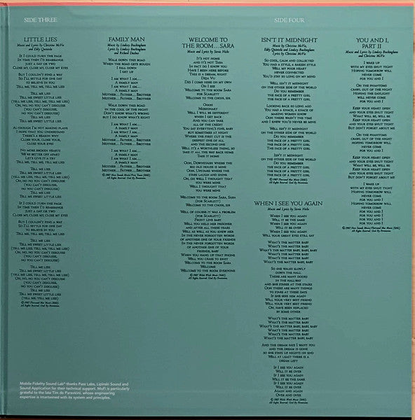 Tracklist: A1. Big Love, A2. Seven Wonders , A3. Everywhere , B1. Caroline , B2. Tango In The Night, B3. Mystified , C1. Little Lies , C2. Family Man , C3. Welcome To The Room... Sara , D1. Isn't It Midnight , D2. When I See You Again , D3. You and I Part II