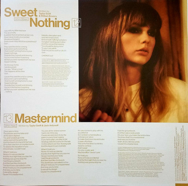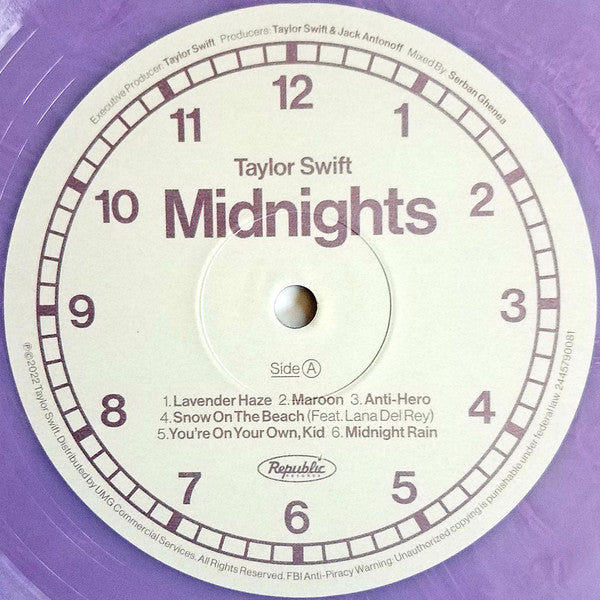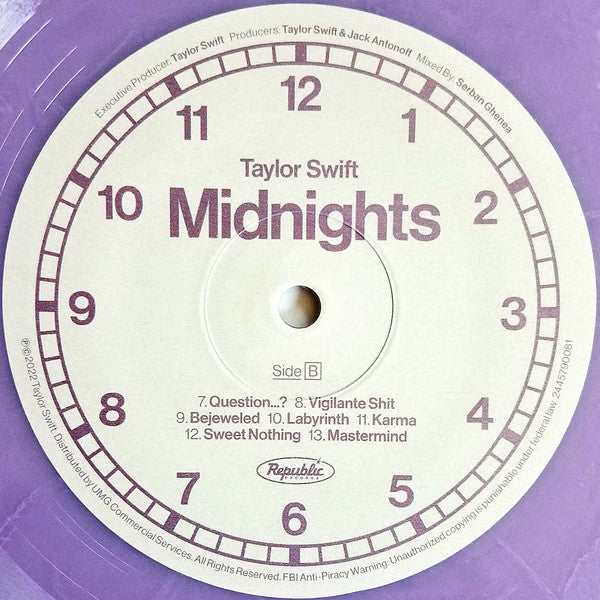 Tracklist: A1. Lavender Haze, A2. Maroon, A3. Anti-Hero, A4. Snow On The Beach, A5. You're On Your Own, Kid, A6. Midnight Rain, B1. Question...?, B2. Vigilante Shit, B3. Bejeweled, B4. Labyrinth, B5. Karma, B6. Sweet Nothing, B7. Mastermind