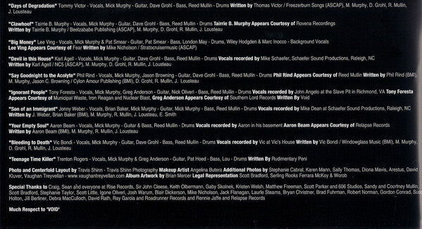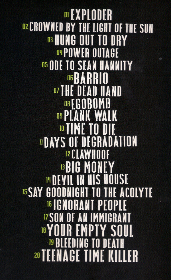 Tracklist: A1. Exploder, A2. Crowned By The Light Of The Sun, A3. Hung Out To Dry, A4. Power Outage, A5. Ode To Sean Hannity, B6. Barrio, B7. The Dead Hand, B8. Egobomb, B9. Plank Walk, B10. Time To Die, C11. Days Of Degradation, C12. Clawhoof, C13. Big Money, C14. Devil In This House, C15. Say Goodnight To The Acolyte, D16. Ignorant People, D17. Son Of An Immigrant, D18. Your Empty Soul, D19. Bleeding To Death, D20. Teenage Time Killer, CD-1. Exploder, CD-2. Crowned By The Light Of The Sun, CD-3. Hung Out To Dry, CD-4. Power Outage, CD-5. Ode To Sean Hannity, CD-6. Barrio, CD-7. The Dead Hand, CD-8. Egobomb, CD-9. Plank Walk, CD-10. Time To Die, CD-11. Days Of Degradation, CD-12. Clawhoof, CD-13. Big Money, CD-14. Devil In His House, CD-15. Say Goodnight To The Acolyte, CD-16. Ignorant People, CD-17. Son Of An Immigrant, CD-18. Your Empty Soul, CD-19. Beading To Death, CD-20. Teenage Time Killer