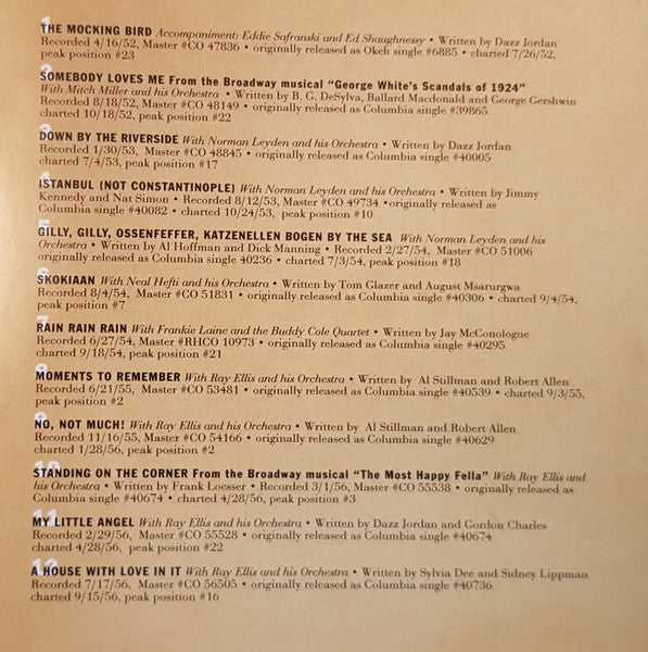 Tracklist: 1. The Mocking Bird (Original 1952 Version), 2. Somebody Loves Me, 3. Down By The Riverside, 4. Istanbul (Not Constantinople), 5. Gilly, Gilly, Ossenfeffer, Katzenellen Bogen By The Sea, 6. Skokiaan, 7. Rain Rain Rain, 8. Moments To Remember, 9. No, Not Much, 10. Standing On The Corner, 11. My Little Angel, 12. A House With Love In It, 13. The Bus Stop Song (a Paper Of Pins), 14. Who Needs You, 15. I Just Don't Know, 16. Put A Light In The Window, 17. There's Only One Of You, 18. Enchanted Island, 19. The Mocking Bird, 20. The Girl On Page 44, 21. Happy Anniversary