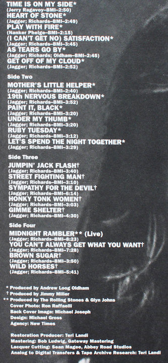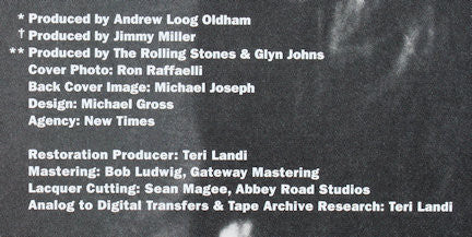 Producer – Andrew Loog Oldham (tracks: A1 to B6), Glyn Johns (tracks: D1), Jimmy Miller (tracks: C1 to C5, D2 to D4), The Rolling Stones (tracks: D1)