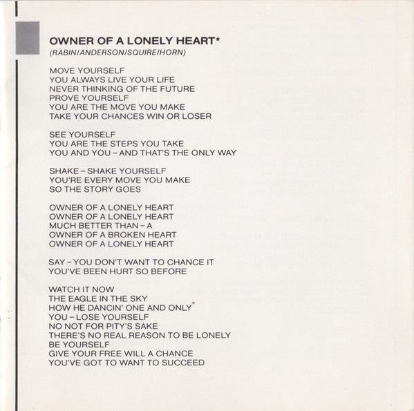 Tracklist: 1. Owner Of A Lonely Heart, 2. Hold On, 3. It Can Happen, 4. Changes, 5. Cinema, 6. Leave It, 7. Our Song, 8. City Of Love, 9. Hearts